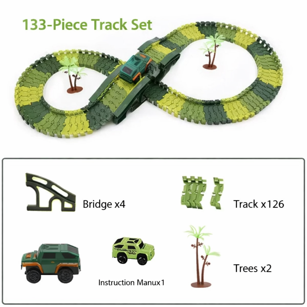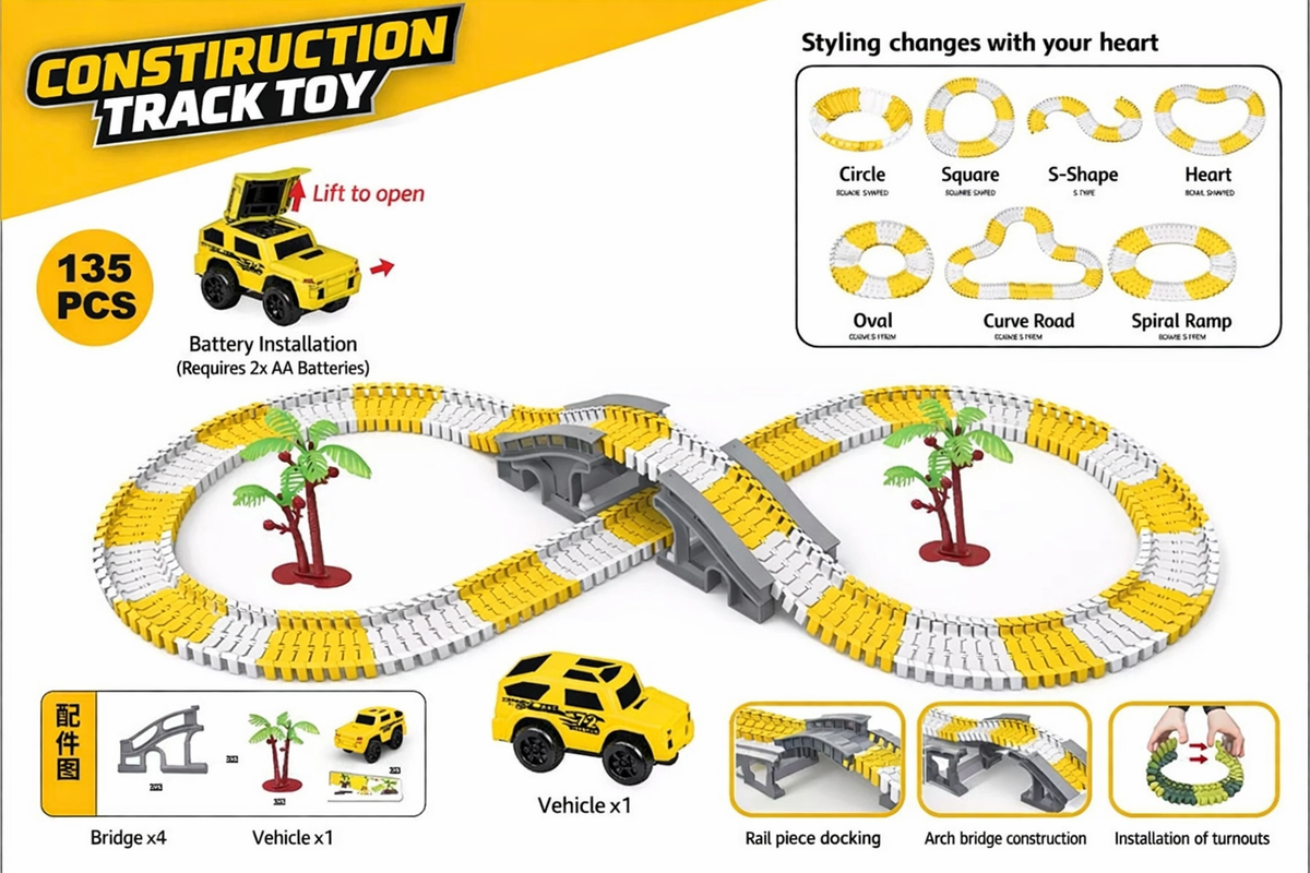 Our 125-piece construction race track toy is packed with fun to create exciting building adventures for kids! The set includes flexible track pieces, electric racing cars, mini construction trucks, traffic accessories, bridges, tunnels, and more — all designed to create beautifully realistic play scenes that give your kids a different and exciting experience.