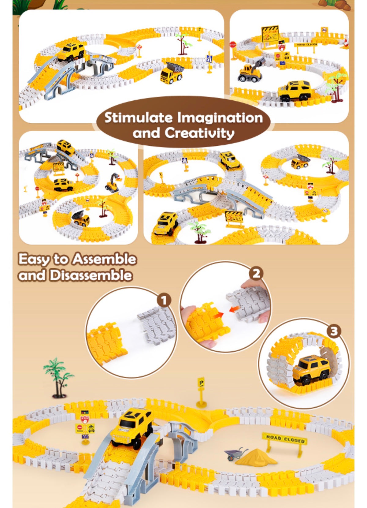 Construction Race Track Toys Set: What's Included in 360PCS? Our construction track toy includes 288 track components, 1 street light, 2 road block,2 electric racing cars, 4 mini construction trucks,2 traffic signs, 2 Y-shape Tracks,2 trees and 4 bridges,10 tunnels, 2 bridge support, 2 bridge 1 map, 2 batteries. Beautifully realistic scenes to give your kids a different experience.